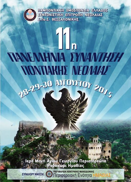 Στην Ιερά Μονή Αγίου Γεωργίου Περιστερεώτα, στο Ροδοχώρι Ημαθίας θα πραγματοποιηθεί το τριήμερο 28 με 30 Αυγούστου 2015 η 11η Πανελλήνια Συνάντηση Ποντιακής Νεολαίας. Εκατοντάδες νέοι ποντιακής καταγωγής από όλα τα μήκη και πλάτη της Ελλάδας θα βρεθούν για τρεις μέρες στον οικισμό της Ημαθίας ώστε να συμμετάσχουν στη Συνάντηση που διοργανώνει η Συντονιστική Επιτροπή Νεολαίας της ΠΟΕ, σε συνεργασία με τον ΣΠΟΣ Θεσσαλονίκης