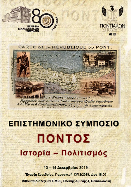 Στο πλαίσιο των επετειακών εκδηλώσεων για τη συμπλήρωση των 80 χρόνων λειτουργίας της Εταιρείας Μακεδονικών Σπουδών (1939-2019) και με αφορμή τη συμπλήρωση 100 χρόνων από την έναρξη της δεύτερης φάσης της Γενοκτονίας των Ελλήνων του Πόντου, η Ε.Μ.Σ., με την επιστημονική σύμπραξη της Επώνυμης Έδρας Ποντιακών Σπουδών του Α.Π.Θ., διοργανώνει Επιστημονικό Συμπόσιο με τον τίτλο: Πόντος. Ιστορία – Πολιτισμός την Παρασκευή 13 και το Σάββατο 14 Δεκεμβρίου 2019.